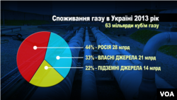 У 2013-му році Україна спожила 63 мільярди кубометрів газу. З них лише 21 мільярд кубометрів видобули із українських покладів газу. 14 мільярдів кубометрів – це резерв газу – він перебуває у підземних сховищах. А майже половину – 28 мільярдів кубометрів палива – Україна купила у Росії.