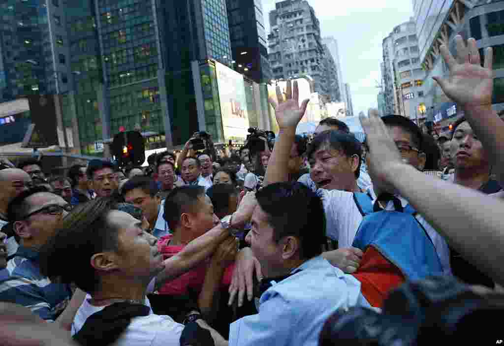 Проти демонстрантів, які виступають за демократію у Гонконгу, виступили натовпи прихильників уряду. Тепер поліція застосовує силу під приводом "розведення" двох груп.