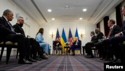 Україну представляють також глава Офісу президента Андрій Єрмак та його заступник Ігор Жовква, міністерка економіки Юлія Свириденко, міністр стратегічної промисловості Олександр Камишін і радник президента Роман Машовець.
