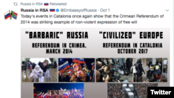 Але на цьому тлі працівники посольства Росії у Південній Африці доклали зусиль для створення колажу із фотографіями дій іспанської поліції під час референдуму в Каталонії на противагу світлинам щасливих учасників референдуму, влаштованого Росією в Криму 2014 року.