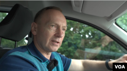 За кермом автомобіля мер Чернігова показує команді голосу Америки руйнування спричинені війною у місті.