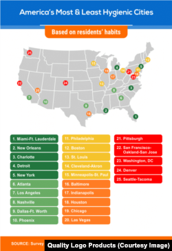 Дослідники виявили, що рівень дотримання гігієни залежить й від місця проживання, й склали рейтинг "найчистіших" міст США. У першій п'ятірці - Маямі, Новий Орлеан і Шарлотт, а також Детройт і Нью-Йорк. "Найбрудніші" - Сієттл, Денвер, Сан-Франциско і Вашингтон.