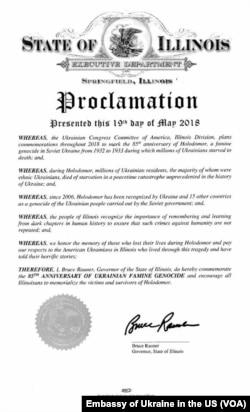 Наприклад, губернатор штату Іллінойс Брюс Ронер видав прокламацію від 19 травня 2018-го року, в якій він вшановує 85-ті роковини «українського голоду-геноциду» та закликає всіх мешканців Іллінойсу пом’янути жертв та вцілілих Голодомору. В тексті також згадується, що з 2006-го року Голодомор в Україні та в 15-ти країнах світу був визнаний геноцидом, який радянський уряд здійснив проти українського народу.