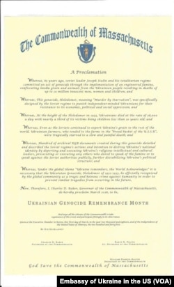 Прокламація губернатора штату Массачусетс починається словами «85 років тому радянський лідер Йосип Сталін та його тоталітарний режим здійснили акт геноциду шляхом запровадження штучного голоду, конфіскації збіжжя та худоби в українського народу, результатом чого стали смерті до 10 мільйонів невинних чоловіків, жінок та дітей».