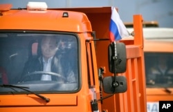 Російське телебачення показало Путіна, вдягненого в джинси та куртку за кермом будівельної вантажівки, переїжджаючи мостом в рамках офіційної церемонії відкриття.