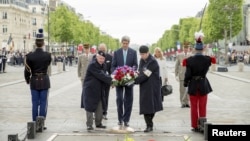 Керрі поклав квіти до Тріумфальної арки, де розташована могила Невідомого солдата і, де 8-го травня 1945 року відбулися велелюдні святкування перемоги над нацистською Німеччиною.