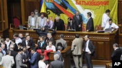 Натомість під Верховною радою тривають акції захисників української мови. В понеділок у пікеті взяли участь з півтори сотні активістів, здебільшого молодь. Протестувальники дуділи в дудки і з допомогою трафарету малювали усім бажаючим на футболках напис «Ні розколу України!»