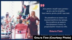 Сьогодні Ольга Гілл – мама семи дітей, блогер, професійна балерина, фотограф і креативний директор онлайн-платформи для сімей Living Notes. Жінка виїхала до Сполучених Штатів з України два десятки років тому та зараз проживає з сім’єю в Сан-Франциско, штат Каліфорнія. Ольга запрошує в свій маленький світ людей звідусіль: у соціальній мережі Instagram за її життям стежить більше 330 тисяч підписників.