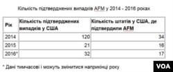 Центр CDC почав спостереження за АFM у 2014 році, коли в країні підтвердили 121 випадок захворювань. Того року хворими були лише діти, здебільшого в межах 7-річного віку.