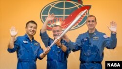 Росіянин Михайло Тюрін, американець Рик Мастраччіо і японець Коічі Ваката занесли факел в ракету, на якій видніла емблема зимових Олімпійських ігор 2014 року в Сочі. При цьому сам факел не запалюватимуть протягом усього польоту з міркувань безпеки.