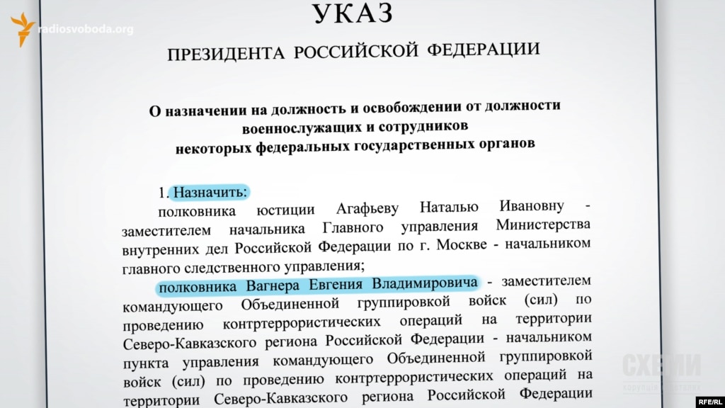Як вже писала Радіо Свобода, скоріш за все, за загадковою «ПВК Вагнера», що допомагає лідеру «ЛНР» Ігорю Плотницькому позбавлятися конкурентів, стоїть полковник внутрішніх військ МВС Російської Федерації Євген Вагнер. Якого президент Путін у вересні 2014 року власним указом призначив головним спеціалістом зі знищення «угрупувань бойовиків на території північнокавказького регіону Російської Федерації».