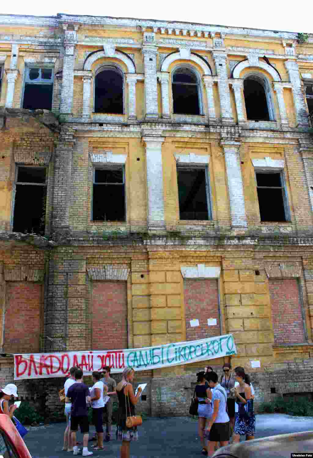 Активісти Молодіжного руху вирішили ще раз привернути увагу до стану будинку Сікорського. На стіні будівлі, де раніше була табличка, що визначала історичну цінність споруди і яка просто зникла, активісти повісили плакат-звернення до Київської адміністрації.