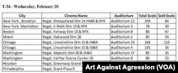 Втім, згідно із даними на веб-сайтах кінотеатрів компанії, зібраними активістами групи "Мистецтво проти агресії", квитків було продано не так багато. В кінотеатрі у Брукліні на 249 місць у залі було продано 84 квитки, на Мангеттані з 78 – 30. У двох кінотеатрах в околиці Вашингтона цифри подібні: 35 з 82 та 23 з 86. Найменше фільм зацікавив глядачів у Г’юстоні, найбільше – в Чикаго. Не виключено, що подивитися фільм прийшло ще менше людей – на Східному узбережжі США у середу випав сильний сніг.