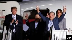 Трамп та його дружина Меланія зайшли на борт літака приблизно на п’ять хвилин, перед тим, як троє колишній в’язнів вийшли з літака, потиснули руки з президентом і привітали ЗМІ та військових.
