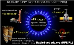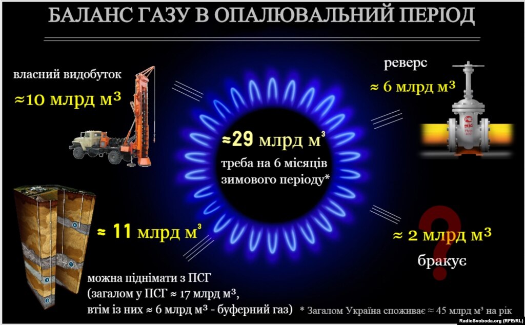 Сьогодні в українських підземних сховищах газу (ПСГ) є трохи менше 17 мільярдів кубів палива. Для гарантування проходження осінньо-зимового періоду туди потрібно було б закачати ще 2 мільярди. (Має бути щонайменше 19). Наразі річний обсяг споживання Україною газу становить близько 45 мільярдів кубів. На опалювальний сезон припадає близько 29 мільярдів. 10 із них – це паливо українського видобутку. Ще 11 мільярдів можна підняти з ПСГ (решта 6 – буферний газ).