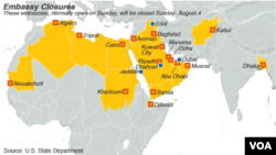 У неділю 4 серпня дипломатичні представництва США були закриті у низці країн, незважаючи на те, що у мусульманських країнах неділя – робочий день. Минулого тижня США оголосили попередження американцям за кордоном і тим, що планують виїхати з країни, про збільшену загрозу тероризму.