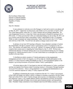 В листі до турецького уряду, Патрік Шенеген, в.о. голови Пентагону США, навів план заходів, що будуть застосовані з метою обмеження участі Туреччини в програмі з розробки винищувачів F-35 у випадку, якщо Туреччина не скасує угоду з Росією з купівлі системи протиракетної оборони С-400. 31 липня, йдеться в листі, представники Туреччини, які на тепер навчаються у США за програмою підготовки до експлуатації F-35, зможуть покинути країну після завершення курсу у разі, якщо рішення Туреччини щодо закупівлі С-400 не зміниться.
